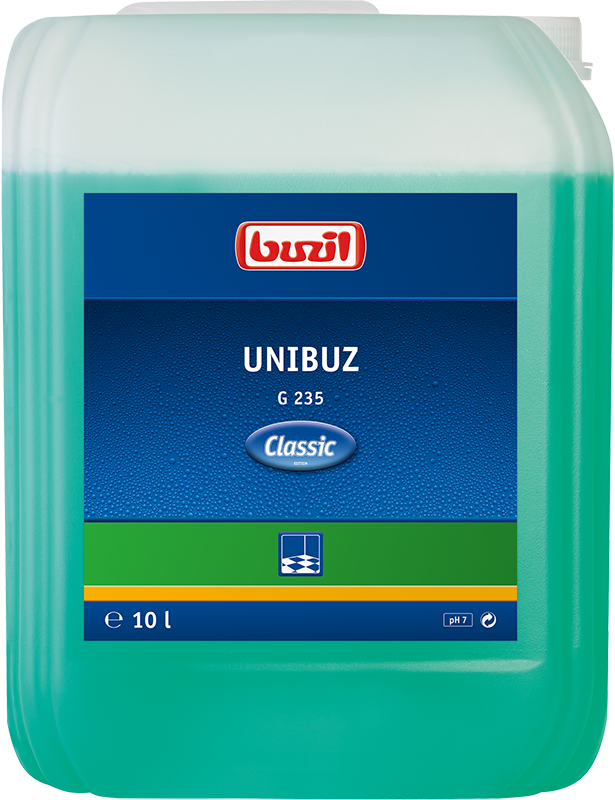 Der Unibuz G 235 ist ein hochkonzentrierter Reiniger für die feuchte Bodenpflege in Industrie, Gesundheitswesen und Großküchen. Speziell formuliert für glatte Oberflächen wie PVC, Linoleum und Keramikfliesen.